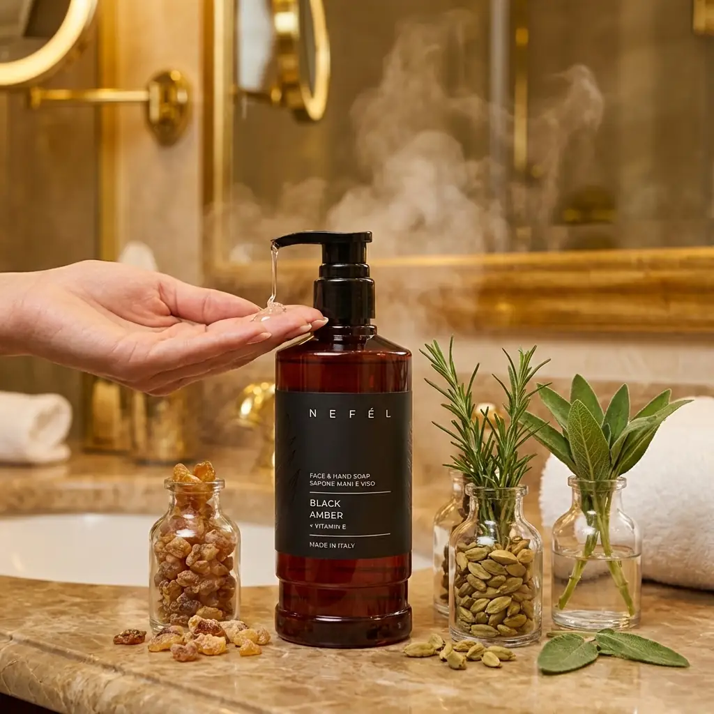 Πλούσια αρωματισμένο υγρό σαπούνι για καθαρισμό των χεριών, με εκχυλίσματα γλυκερίνης, άφηνει τα χέρια απαλά και με αρωματισμένα. Ο εκλεπτυσμένος αισθησιασμός του κεχριμπαριού και το άρωμα του ξύλου προσδίδουν στο σαπούνι ένα ελαφρώς καπνιστό άρωμα που παραπέμπει στα πολυτελή αρώματα του παρελθόντος
